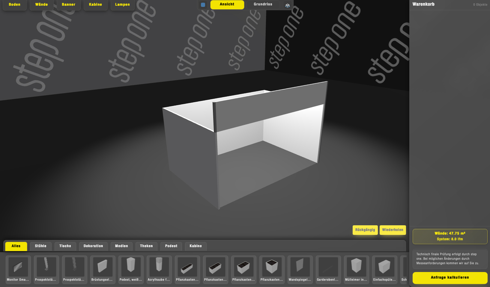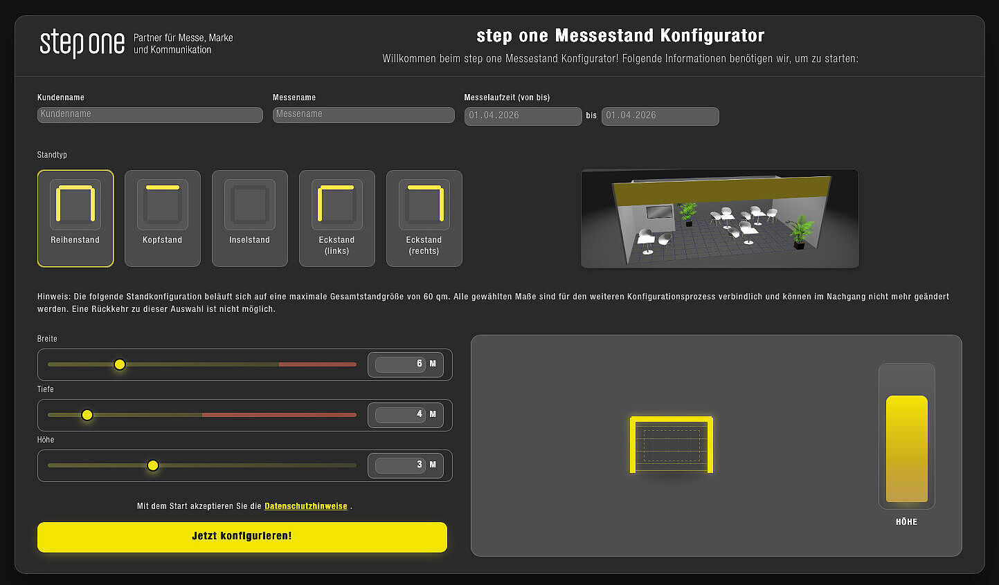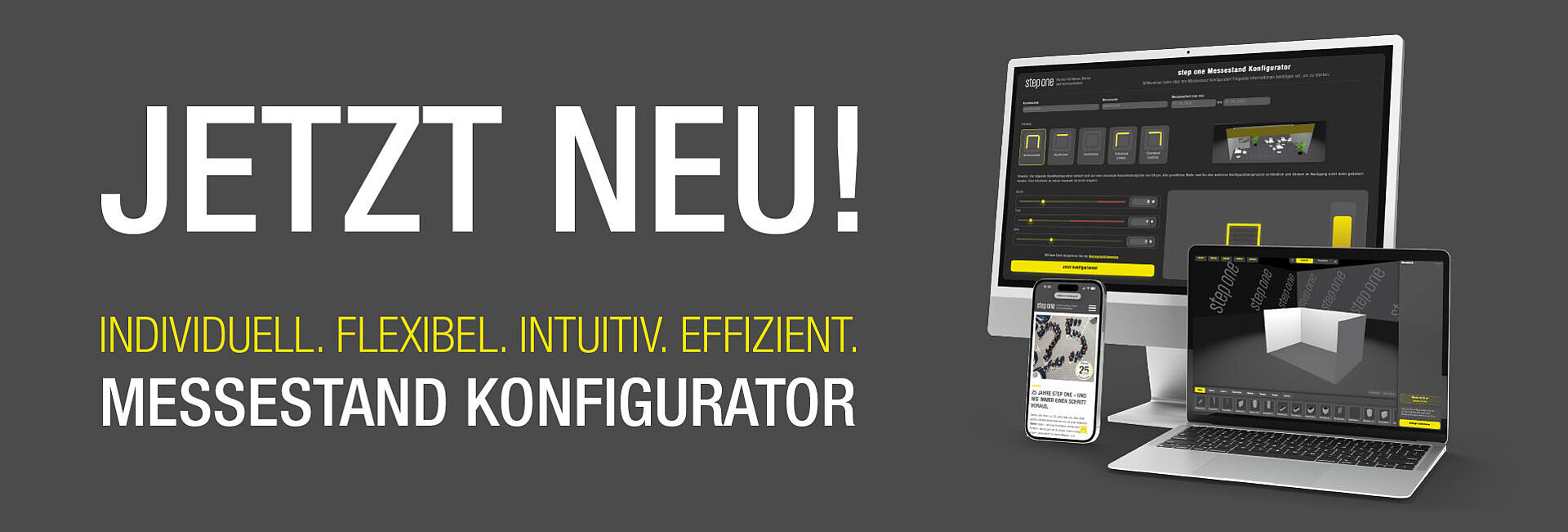 Der step one Konfigurator ermöglicht es Ihnen, in wenigen Schritten Stände bis zu 60 m² zu erstellen, Details flexibel anzupassen und Ihren Auftritt genau auf Ihre Marke abzustimmen. Starten Sie jetzt und verwandeln Sie Ihren Messestand in