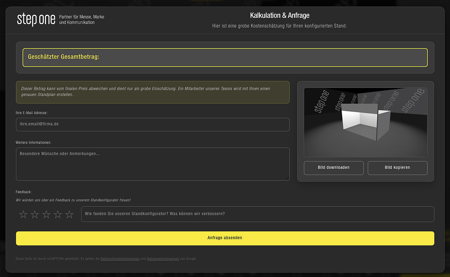 Nach Abschluss Ihrer Konfiguration können Sie direkt eine unverbindliche Anfrage an step one senden. Der Gesamtpreis wird sofort angezeigt – inklusive Material, Montage, Logistik und Service. Unser Team bespricht anschließend alle Details persönlich mit Ihnen. Besondere Wünsche, die der Konfigurator nicht abbildet? Kontaktieren Sie uns unter info@stepone-hamburg.de oder lassen Sie unser Kreativteam die Konfiguration für Sie übernehmen. Wir erstellen ein individuelles Angebot mit passendem Messekonzept.