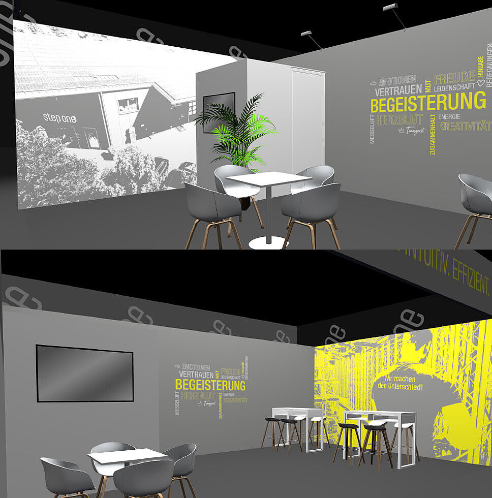Ihr individuell gestalteter Messestand. Nach der kreativen Planung beginnt die Umsetzung. Sobald der Auftrag erteilt ist, übernimmt step one die technische Planung und grafische Ausarbeitung, damit Ihr Messestand sowohl statisch einwandfrei als auch optisch exakt nach dem Konzept umgesetzt wird.
